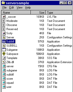 This application stores and keeps track of players scores and accounts. It is NOT necessary to have the billing.exe running to run SubSpace (see SUBGAME.EXE) neither is is nessecary to run the SUBBILL.EXE on the same machine as the server (see SERVER.INI)
